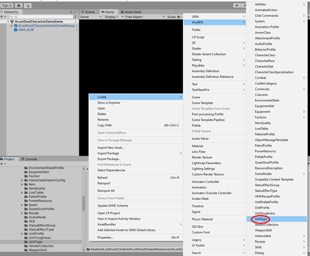 To create a unit type, find (or create) the GameName/Resources/GameName/UnitType folder in the project tab and right click. Choose Create > AnyRPG > UnitType.